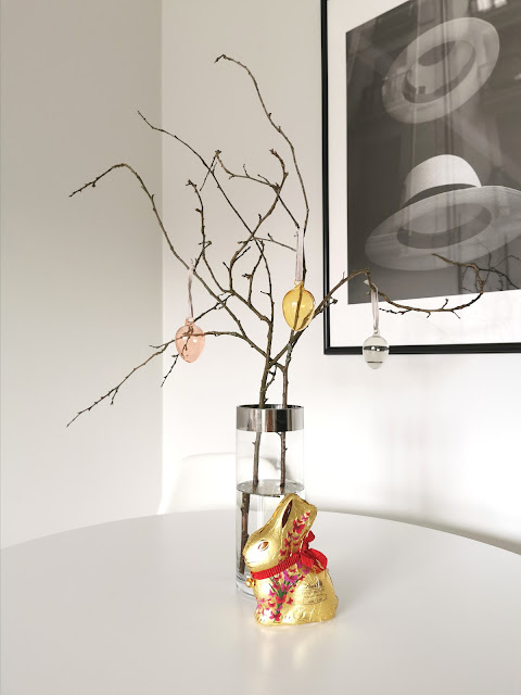 Pääsiäispöytään ostettiin Lindtin suklaaporkkanoita sekä tälle päivälle odotan vielä Pikku-T:tä virpomaan ja tuo suklaapupu on hänelle palkaksi <3.